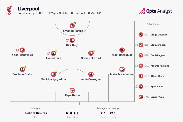 这是利物浦近600场英超联赛第一次出现0射正的情况,上一次出现要追料到2010年3月8日利物浦0-1不敌维冈竞技的比赛,那时的利物浦出场威望如下
