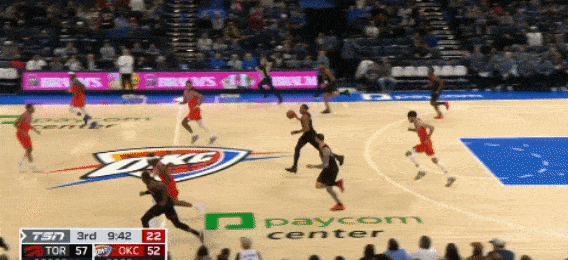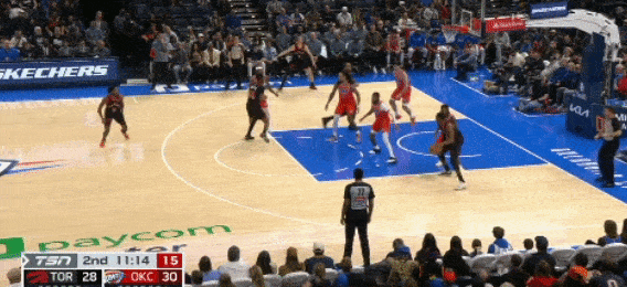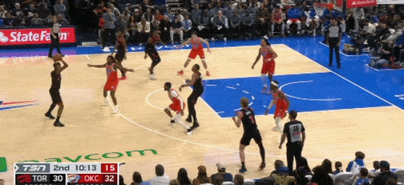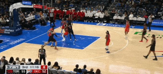 第三节9分40秒,猛龙打快攻反击,巴雷特接巴恩斯传球后上篮得分,