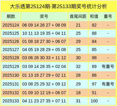 和值分析:上期前区奖号和值为100,较上期数据上涨49点,开出大和值。最近10期前区奖号数据露出小和值较热,本期预测和值开在89-99区间和值。